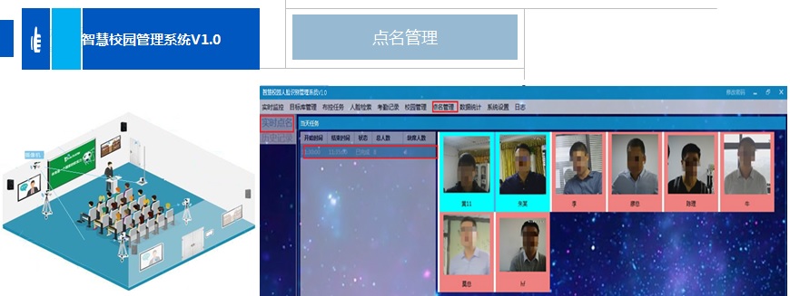 对班级教室里的学生进行定时动态人脸点名,实时显示点名的状态;当点名完成后点到名的图片变成蓝色,没点到为红色,没点名的人员也可以通过手动确认点名;点名时间可以可自由设定。
